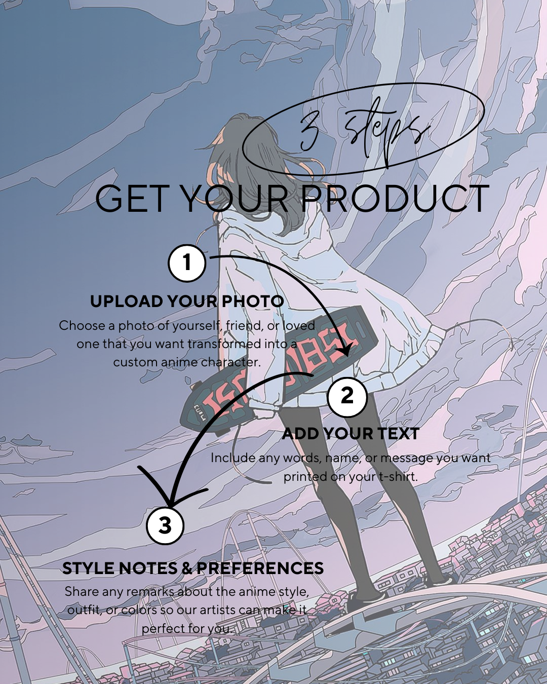 Simply upload your photo, and our artists will transform it into a unique anime-style character. Weβll then print the artwork onto your t-shirt with high-quality colors and detail.